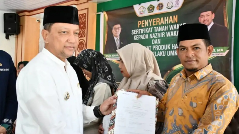 Keizalinnews.com|Takengon– Penjabat Bupati Aceh Tengah Ir. T. Mirzuan, MT, menghadiri penyerahan sertifikat tanah wakaf kepada nazhir wakaf dan penyerahan produk halal kepada pelaku Usaha Mikro Kecil dan Menengah (UMKM), bertempat di Gedung PLHUT Aceh Tengah, Jumat (19/04/2024).