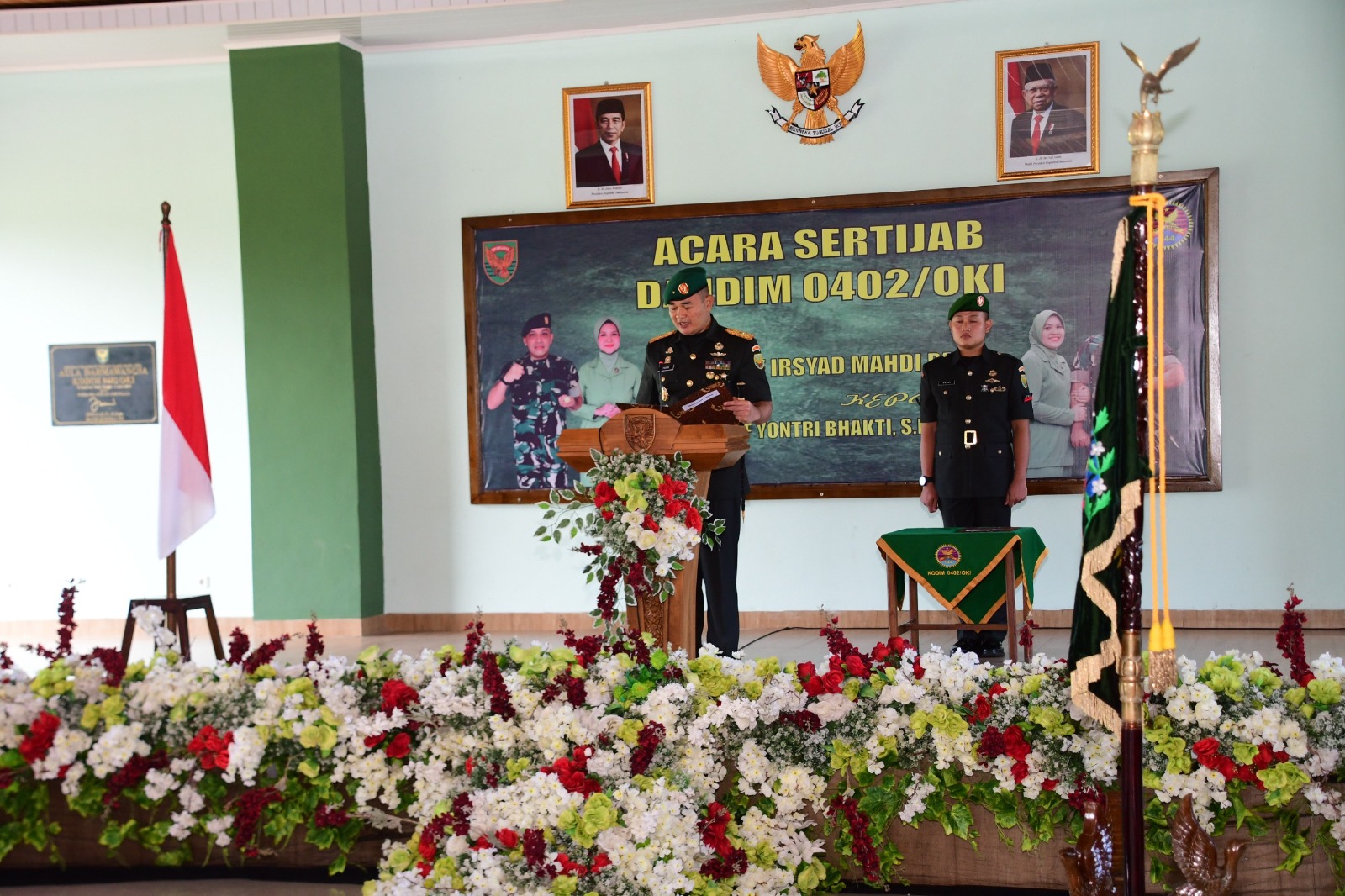 Prosesi acara Sertijab Dandim 0402/OKI, dari Letkol Inf Irsyad Mahdi Pane kepada Letkol Inf Yontri Bhakti tersebut, dipimpin langsung oleh Danrem.