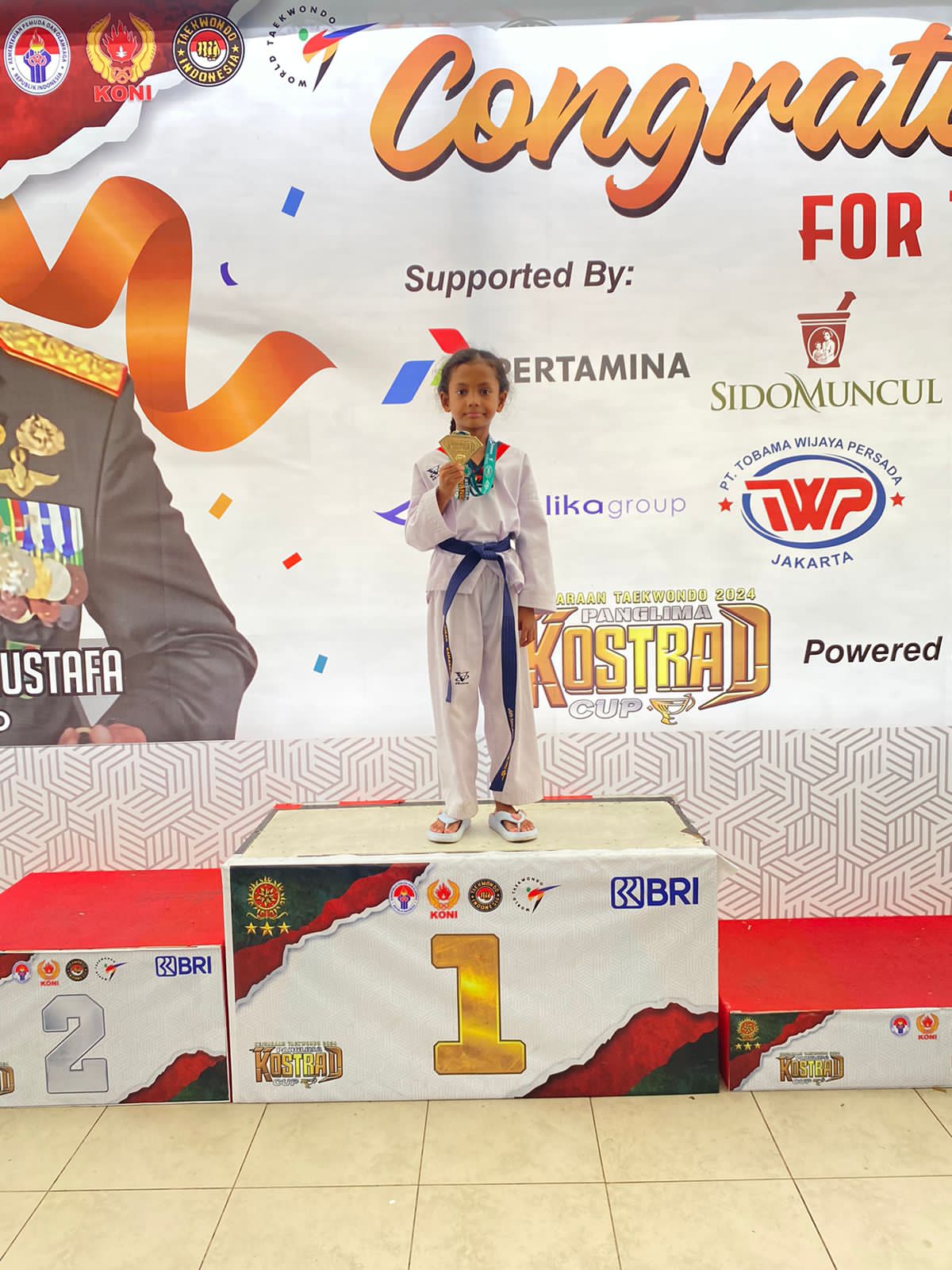 KeizalinNews.com Jakarta Timur — Mengukir prestasi dengan menjadi Juara Pertama dan meraih Medali Emas kyorugi kelas Pemula Liga Taekwondo Pangkostrad Cup dan mendapatkan Medali Emas dan Piagam Penghargaan, Kejuaraan ini digelar di Gelanggang Olahraga Ciracas, Jl. Raya Bogor , Kel Ciracas, Kec. Ciracas, Kota Jakarta Timur. Minggu (12/5/2024).