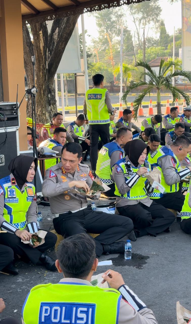 Perwira tiga melati ini, menyempatkan sarapan pagi nasi pecel bersama 150 anggotanya sebelum bertugas.