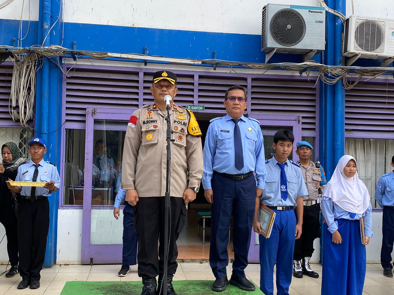 KeizalinNews.com Jakarta — Kapolsek Koja Kompol Muhammad Syahroni, SH.,M.Si bersama sejumlah anggota Polsek Koja menghadiri kegiatan Police Go To School serta penyerahan Piagam Penghargaan di SMK Cikini yang terletak di Jl. Alur Laut, Kelurahan Rawa Badak Utara, Kecamatan Koja, Jakarta Utara. Senin ( 27/5/2024).