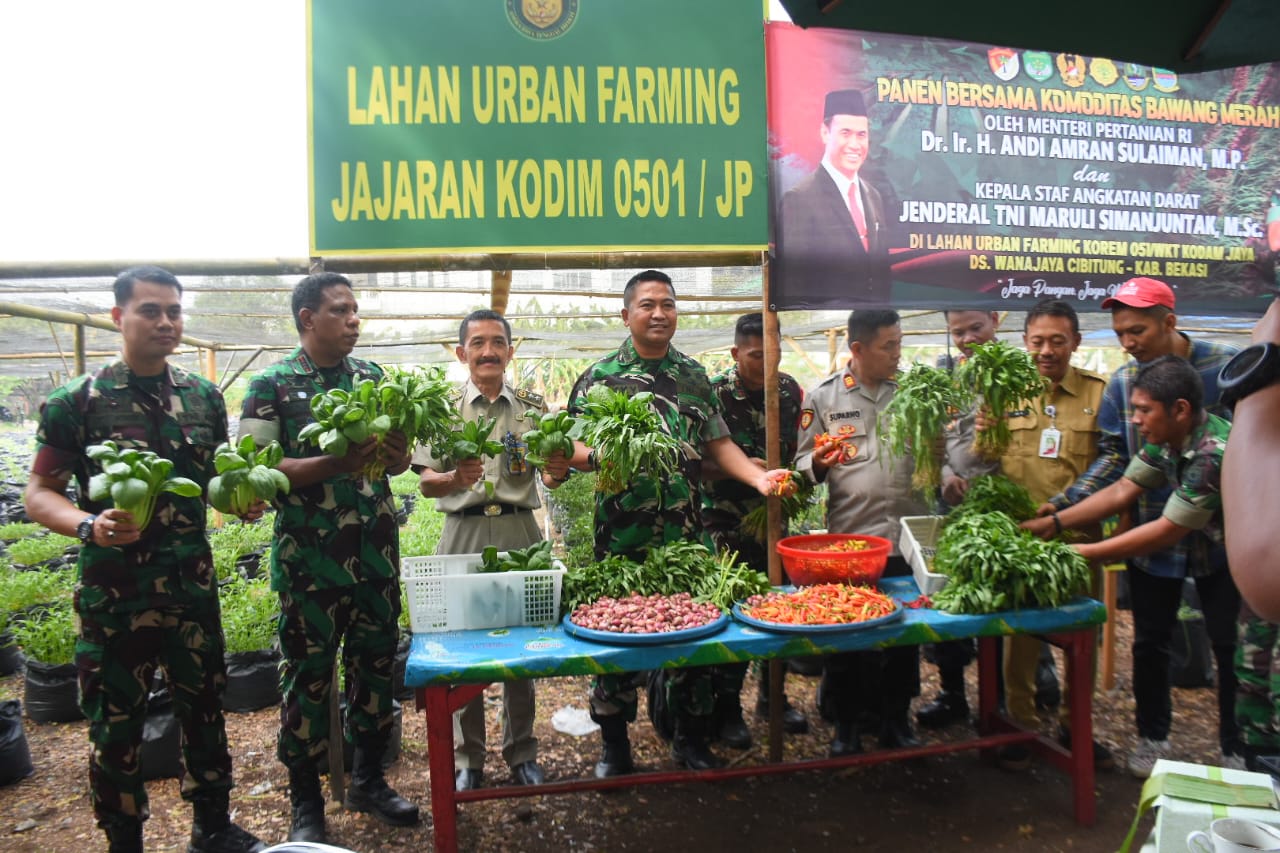 Dalam kegiatan ini kita juga melaksanakan panen berbagai macam jenis tanaman seperti Bawang Merah, Cabe, Kangkung, Sawi dan Pakcoi, sebagai bentuk keseriusan kami dalam memperkuat ketahanan pangan di wilayah perkotaan dengan menggunakan media tanam polybag”, tutup Kasdim 0501/JP.