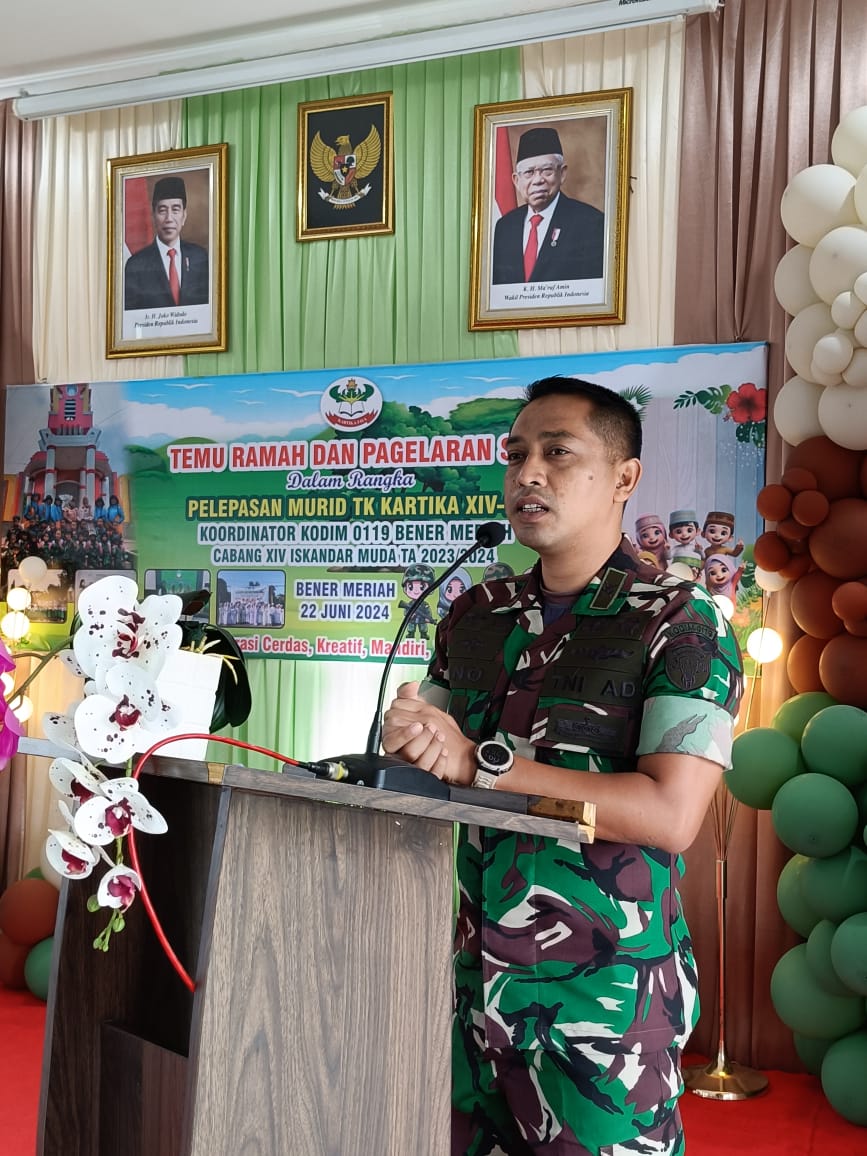 Sekretaris Dinas Pendidikan Bener Meriah Bpk Saidi M.Nurdin, S.Pd.,M.Pd., menyampaikan apresiasi kepada Yayasan TK Kartika Cabang XIV-21 Koordinator Kodim 0119/BM dan terimakasih yang sebesar-besarnya dalam rangka ikut mendidik anak-anak sebagai generasi penerus Bangsa, khususnya di Kabupaten Bener Meriah. Kami bangga kepada Yayasan TK Kartika Cabang XIV-21 Koordinator Kodim 0119/BM yang ikut andil dalam rangka mencerdaskan anak-anak di Kabupaten berhawa sejuk ini. Tuturnya.