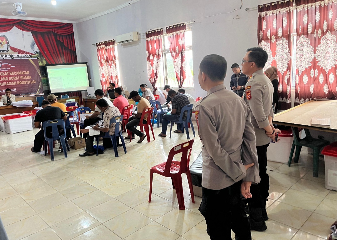 Aceh Timur-NAD,Kapolres Aceh Timur, Polda Aceh, AKBP Nova Suryandaru, S.I.K. menyampaikan rasa terima kasih kepada seluruh pihak yang terlibat dalam Penghitungan Ulang Surat Suara (PUSS) Kabupaten Aceh Timur. Ungkapan terima kasih tersebut disampaikan Kapolres saat memantau langsung Rekapitulasi Rapat Pleno PUSS Tingkat Kabupaten yang berlangsung di Kantor Komisi Independen Pemilihan (KIP) Kabupaten Aceh Timur, (Sabtu, (13/07/2024) malam.
