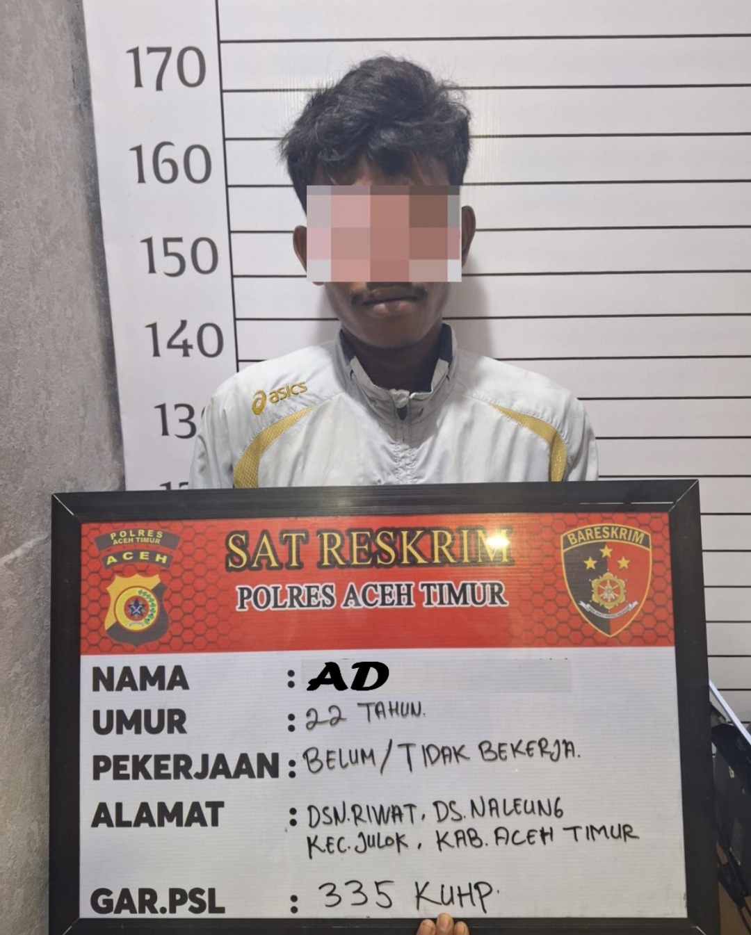 Kasat Reskrim Polres Aceh Timur, Polda Aceh, Iptu Adi Wahyu Nurhidayat, S.Tr.K.,S.I.K. mengungkapkan peristiwa ini bermula dari informasi Kapolsek Julok Iptu Rudiono, S.Sos. yang menyebutkan bahwa warga Desa Naleung, Kecamatan Julok, Kabupaten Aceh Timur mengamankan AD, 22 tahun, warga Desa Naleung yang diduga melakukan pengancaman dengan menggunakan pisau terhadap warga setempat.
