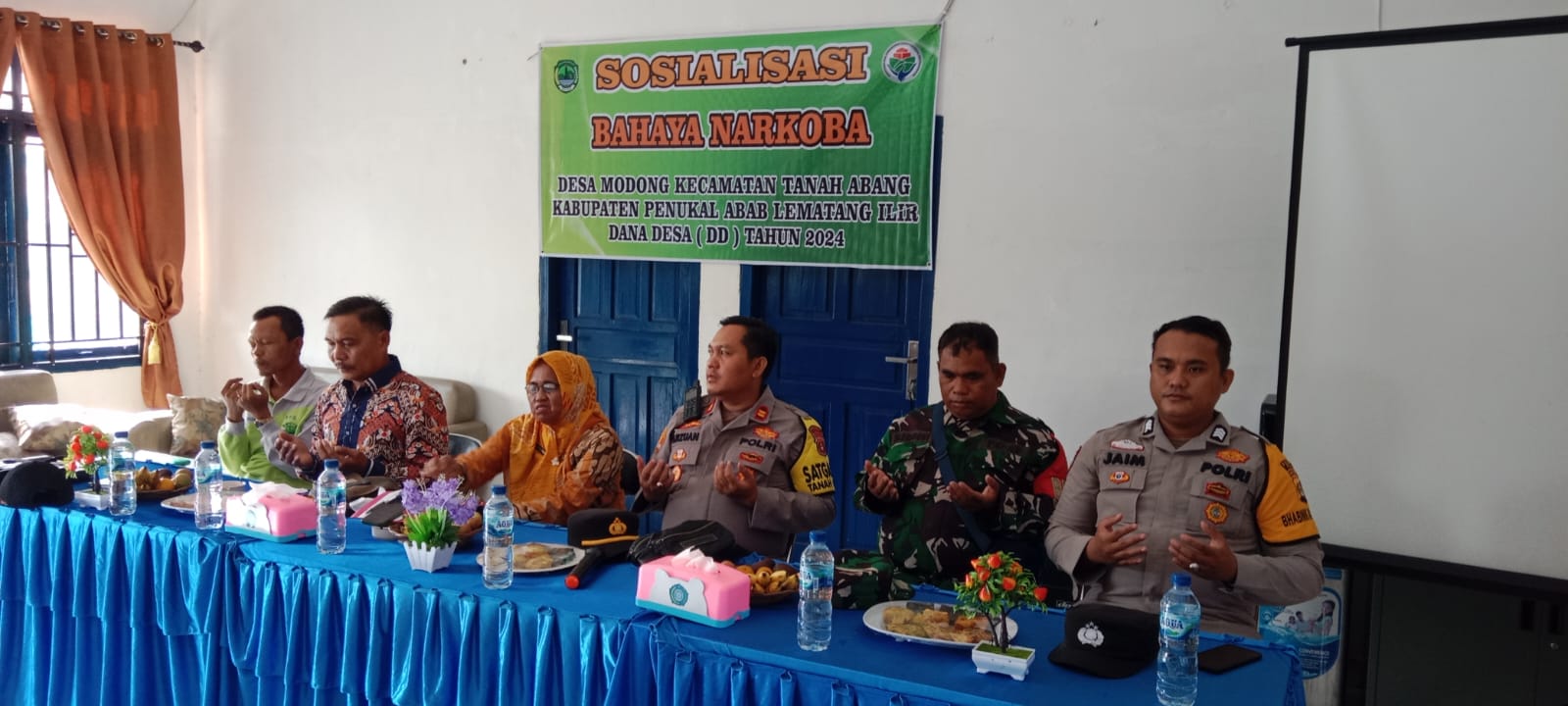 Kapolsek Tanah Abang IPTU Arzuan, SH memimpin langsung kegiatan ini bersama timnya, yang terdiri dari Kanit Propam AIPDA Akipsah, Kanit Intelkam AIPDA Roy P. Saragih, SH, Anggota Intelkam BRIPKA Ali Sadikin, dan Bhabinkamtibmas BRIGPOL M. Zaim, SH. Hadir pula Kepala Desa Modong Mustakim beserta perangkat desa, Ketua BPD Desa Modong Fuadi, Kepala Puskesmas Tanah Abang dr. Almustazirin, M.Kes beserta staf, serta peserta pemuda dan perwakilan masyarakat Desa Modong.