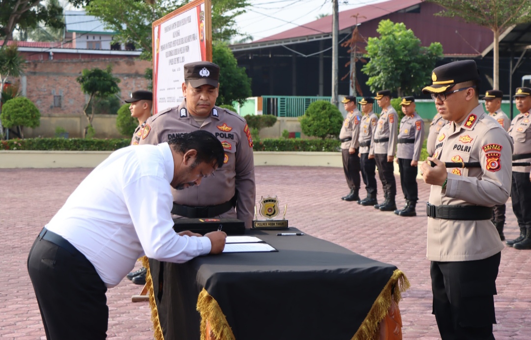 Dalam Apel Pencanangan Zona Integritas tersebut juga dilakukan penandatanganan Komitmen Bersama yang diwakili oleh Kasat Intelkam AKP Ketut Supriyatnha, Kasat Reskrim yang diwakili oleh KBO Ipda Darliswan, Kasat Lantas Iptu Eko Suhendro, S.H. dan Kepala SPKT Iptu Muhammad Zakaria Siregar dengan disaksikan oleh Kapolres dan Wakapolres.(*)