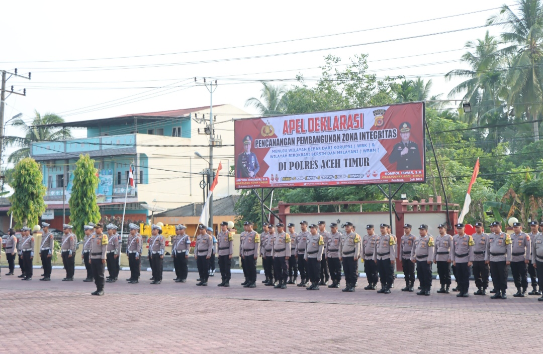 Aceh Timur-NAD,Kepolisian Resor Aceh Timur, Polda Aceh pada Selasa, (23/07/2024) pagi, menggelar Apel Deklarasi Pembangunan Zona Integritas Menuju Wilayah Bebas Korupsi (WBK) dan Wilayah Birokrasi Bersih Dan Melayani (WBBM) yang dipimpin langsung oleh Kapolres Aceh Timur AKBP Nova Suryandaru, S.I.K.