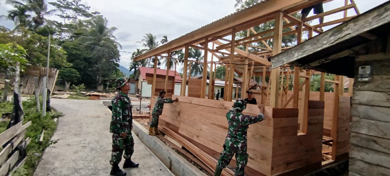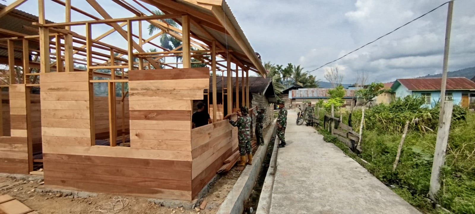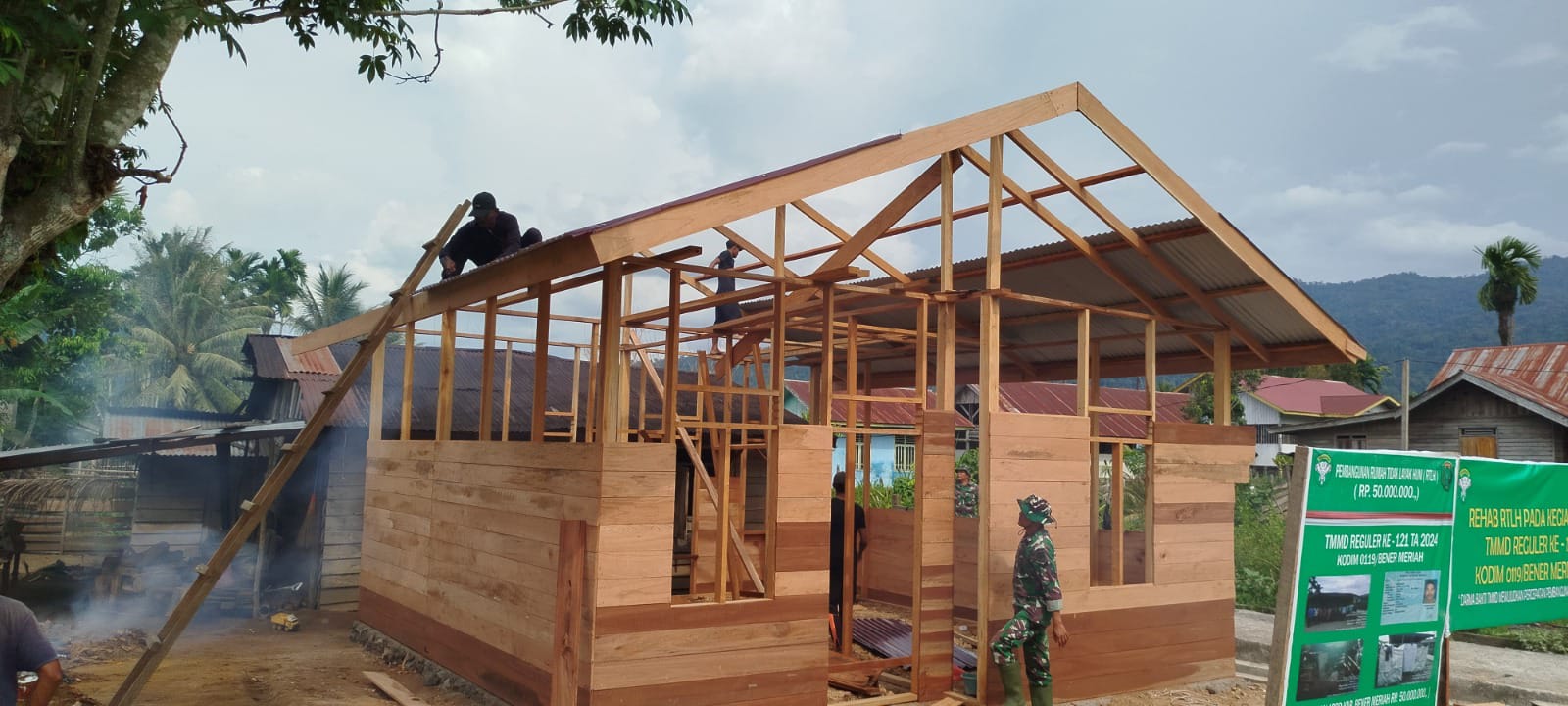 Progres pembangunannya saat ini memasuki tahap pemasangan dinding kayu dan pemasangan atap rumah (dari seng), tambahnya.