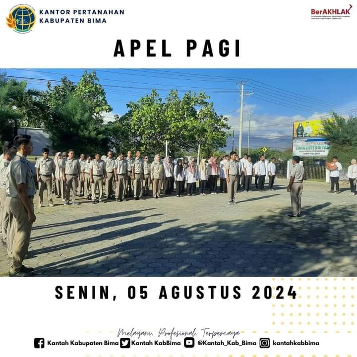 KeizalinNews.comKabupaten Bima. Guna penegakan kedisiplinan kerja dan terciptanya pengembangan SDM yang bermutu serta berkualitas pada lingkup instansinya. Kantor Pertanahan (Kantah) Kabupaten Bima melaksanakan Apel Pagi yang di ikuti seluruh pegawai di halaman kantor setempat. Senin (05/08/24)