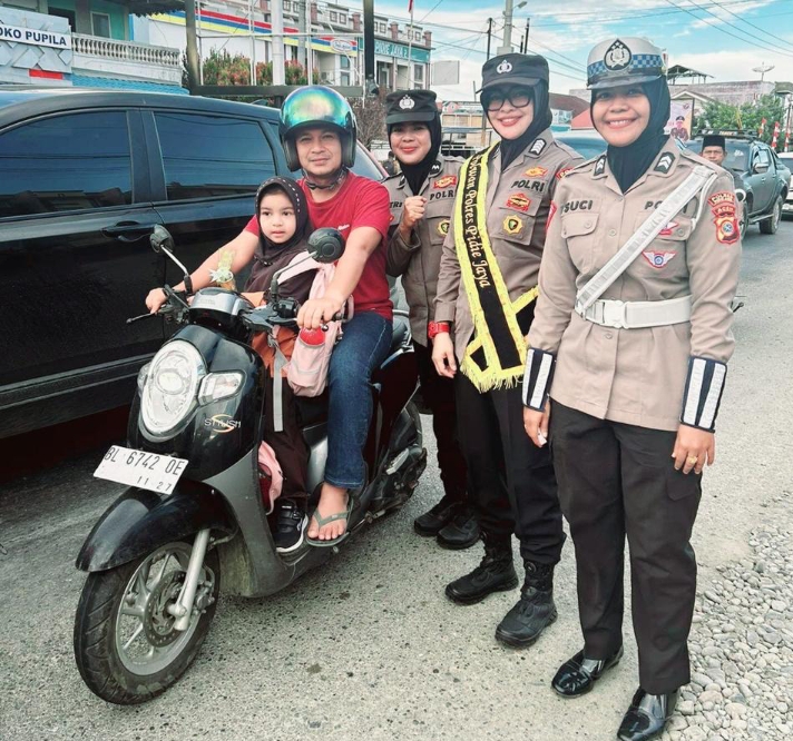 Selain mengatur arus lalu lintas secara profesional, Polwan juga membagikan souvenir kepada pengendara yang mematuhi peraturan lalu lintas dan memiliki kelengkapan surat-surat kendaraan.
