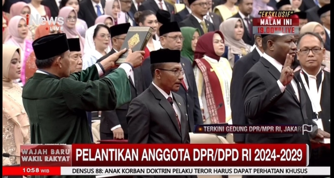 Pelantikan 152 anggota DPD RI terpilih tahun 2024 berlangsung di Gedung MPR RI Senayan yang dipandu oleh Ketua Mahakamah Agung RI dan ikut disaksikan oleh Presiden Jokowi