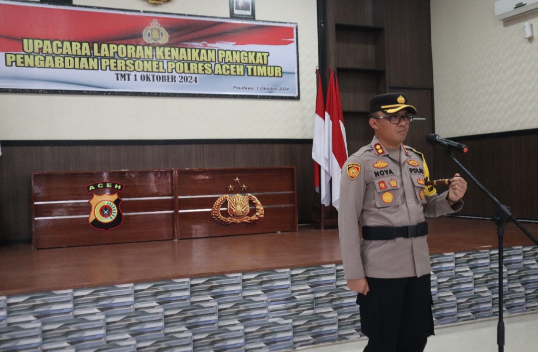 Keizailinnews.Online Aceh Timur Nanggroe Aceh Darussalam NAD – Bertempat di Aula Bhara Daksa, pada Senin, (01/10/2024) siang, Kapolres Aceh Timur, Polda Aceh AKBP Nova Suryandaru, S.I.K. mempimpin Upacara Laporan Kenaikan Pangkat Pengabdian TMT 1 Oktober 2024.