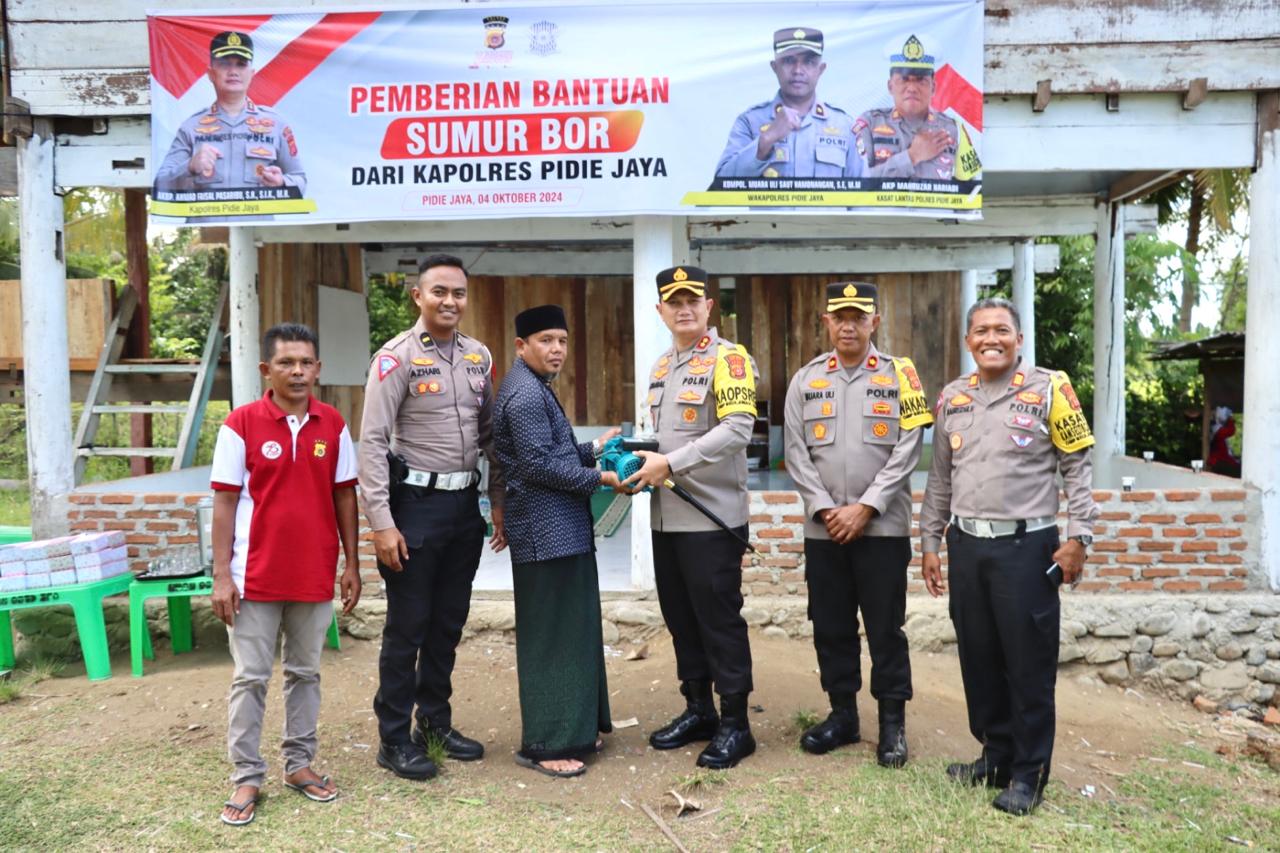 Keizalinnews.Online|*Pidie Jaya*-: Sebagai bagian dari komitmen sosial Polri melalui program Jum’at Berkah, Kapolres Pidie Jaya, AKBP Ahmad Faisal Pasaribu, S.H., S.I.K., M.H., bersama jajaran Polres Pidie Jaya, menyerahkan bantuan sumur bor kepada Dayah Bustanus, Gampong Cot Lheue Rheng, Kecamatan Trienggadeng, pada Jumat, 4 Oktober 2024. Penyerahan dilakukan pukul 17.00 WIB dengan dihadiri oleh pimpinan Dayah, Tgk Muchtar, serta tokoh masyarakat setempat.