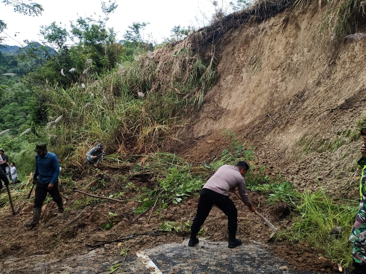 Keizalinnews.Online|Redelong-: Personel Polsek Wih Pesam Polres Bener Meriah sigap tangani tanah longsor yang diakibatkan hujan deras di Kampung Syura Jadi, Kecamatan Wih Pesam, Kabupaten Bener Meriah, Jumat, 18 Oktober 2024.