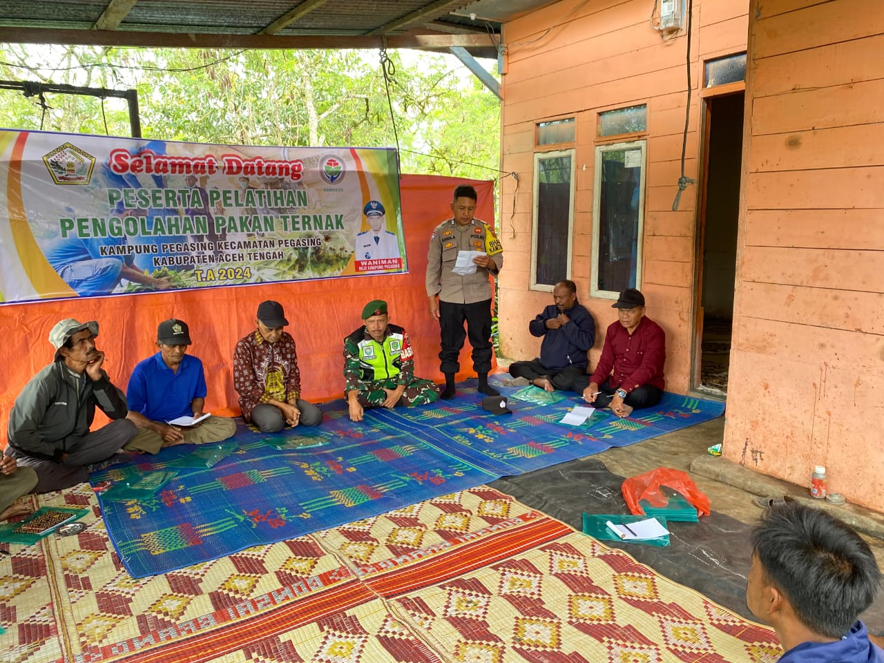 Keizalinnews.Online|Takengon-: Bhabinkamtibmas Polsek Pegasing, Polres Aceh Tengah Bripka Andia Agusri memberikan pelatihan (Selase) cara pembuatan pakan ternak (Selase) kepada sejumlah peternak.