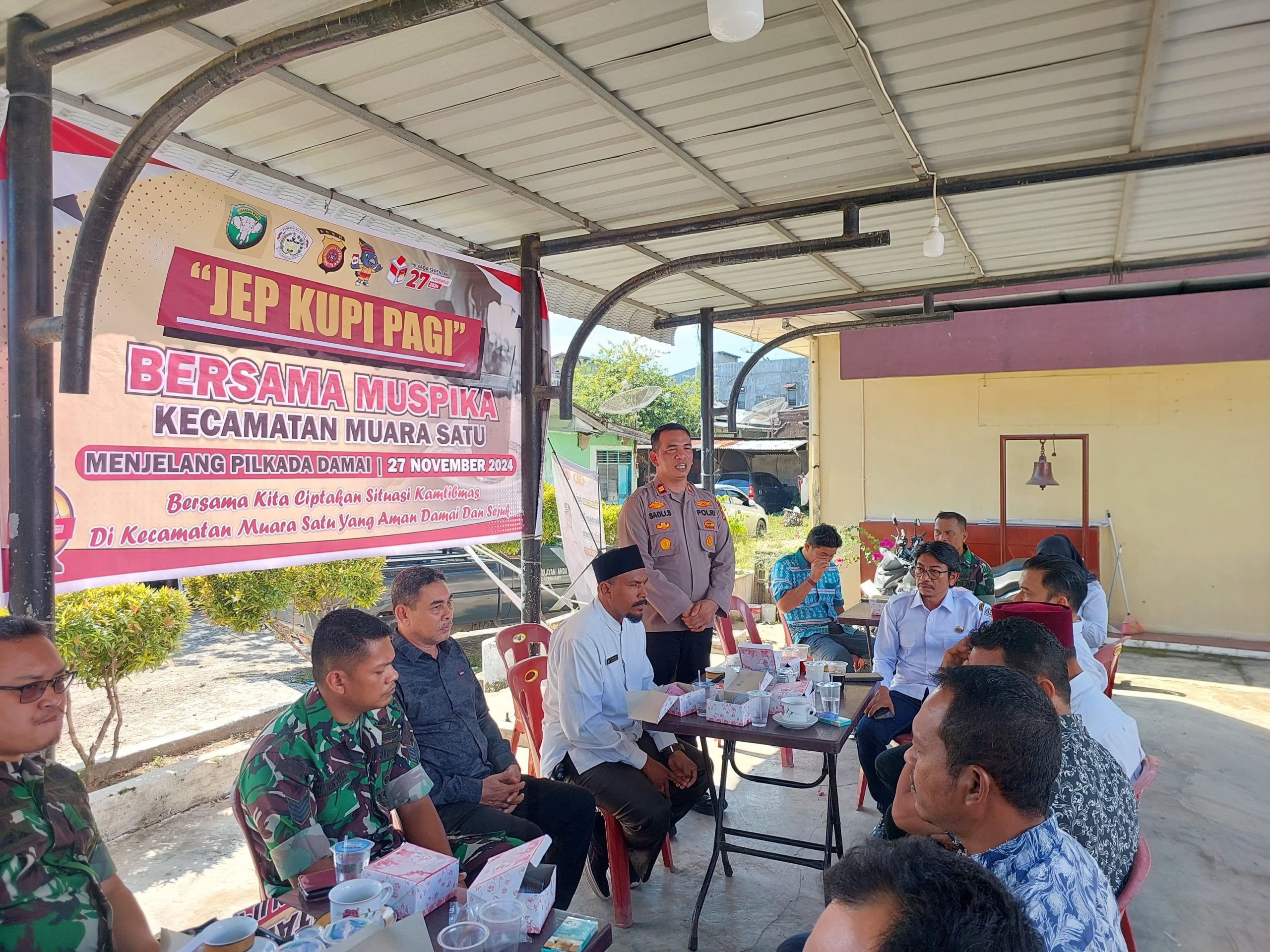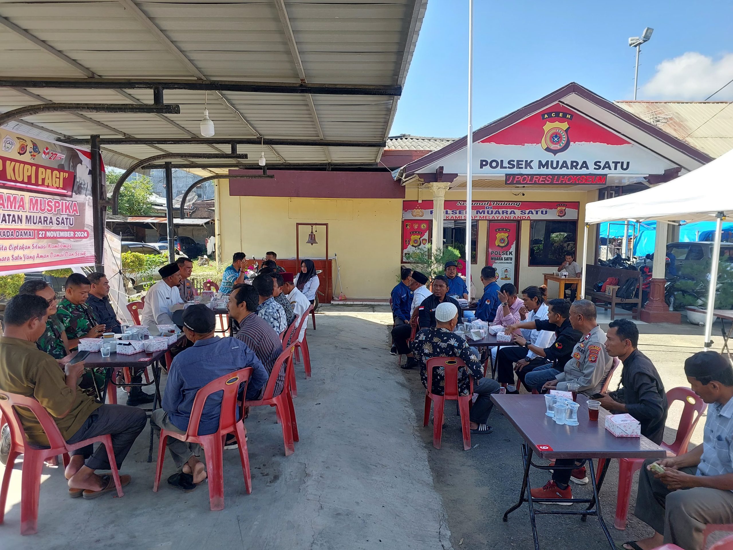 Keizalinnews.Online|LHOKSEUMAWE-: Menyambut Pilkada serentak pada 27 November 2024, Kapolsek Muara Satu, Iptu Syadli, S.E., bersama Muspika Kecamatan Muara Satu menggelar acara “Jep Kupi Pagi” di Mapolsek Muara Satu, Rabu (23/10/2024) pagi.