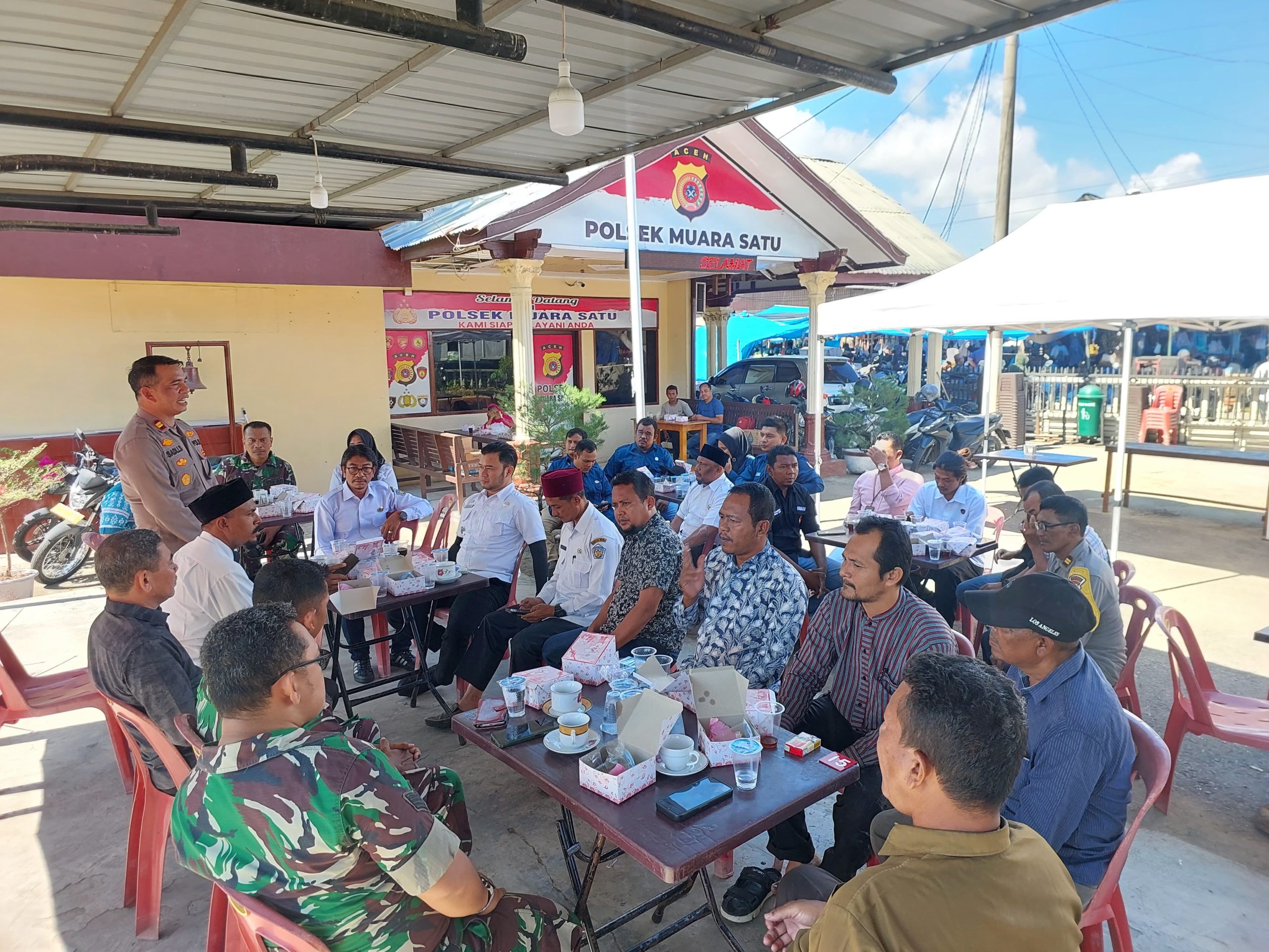 Keizalinnews.Online|LHOKSEUMAWE-: Menyambut Pilkada serentak pada 27 November 2024, Kapolsek Muara Satu, Iptu Syadli, S.E., bersama Muspika Kecamatan Muara Satu menggelar acara “Jep Kupi Pagi” di Mapolsek Muara Satu, Rabu (23/10/2024) pagi.