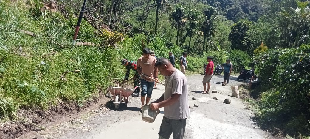 Babinsa Koramil 02/Wps, Bersama Warga Gotong Royong Tambal Jalan Berlubang