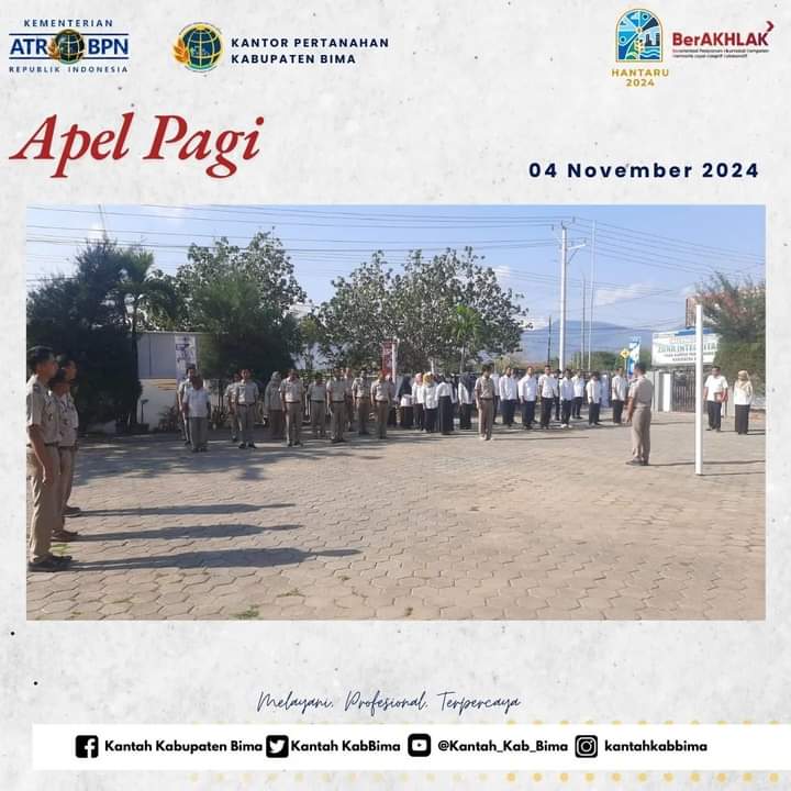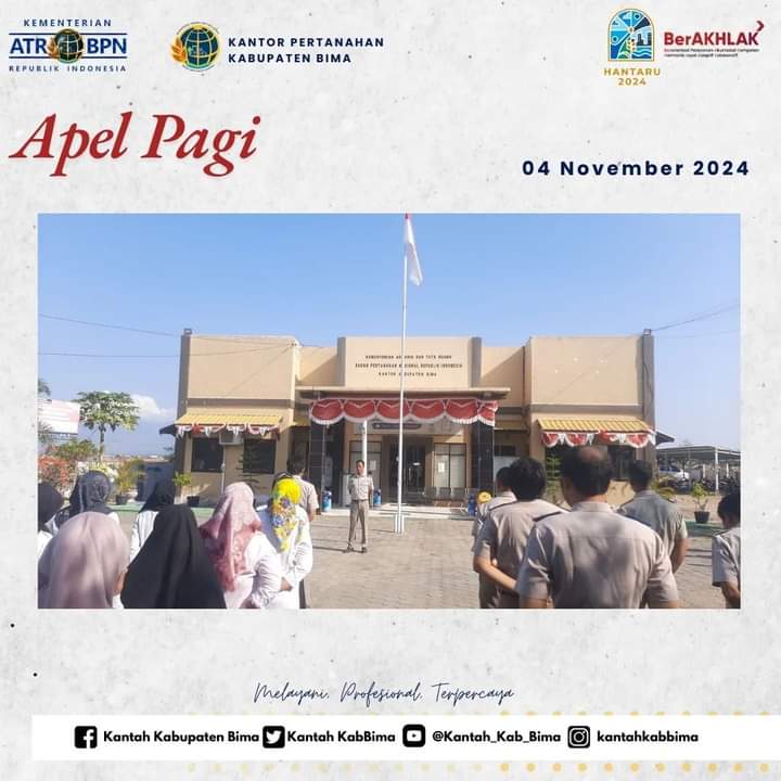 KeizalinNews-com – Kabupaten Bima. Kantor Pertanahan (KANTAH) Kabupaten Bima menggelar apel rutin pagi Senin yang dilaksanakan di halaman depan Kantor setempat, Senin (04/11/2024).