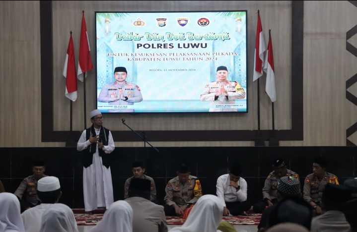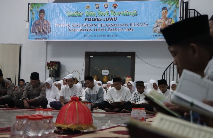 KeizalinNews.Com,Luwu (Sulsel)– Dalam rangka mendukung kelancaran dan keamanan pelaksanaan Pemilihan Kepala Daerah (Pilkada) Kabupaten Luwu 2024, Polres Luwu menggelar acara Dzikir dan Doa Bersama di Aula Tebbakke Tongngenge Mapolres Luwu. Jumat (15/11/2024).
