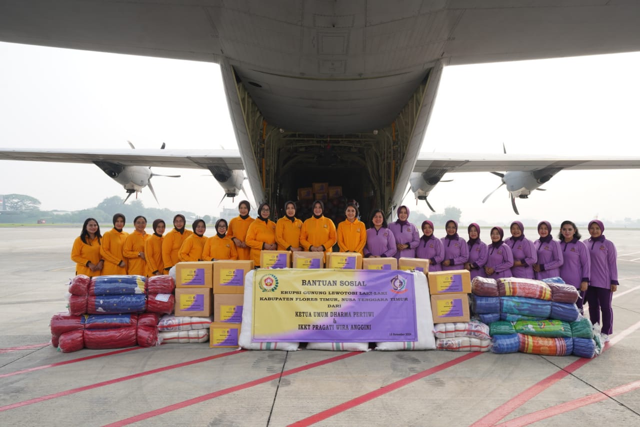 KeizalinNews.Online Jakarta — Ketua Umum (Ketum) Dharma Pertiwi (DP) Ny. Evi Agus Subiyanto sekaligus Ketum Ikatan Kesejahteraan Keluarga TNI (IKKT) Pragati Wira Anggini (PWA) menyerahkan Bantuan Sosial (Bansos) untuk masyarakat terdampak erupsi gunung Lewotobi Laki-Laki di NTT kepada Danskadron 31 Letkol Pnb Chandra Danang Jaya, bertempat di Baseoff Lanud Halim PK, Jakarta Timur, Jumat (15/11/2024).