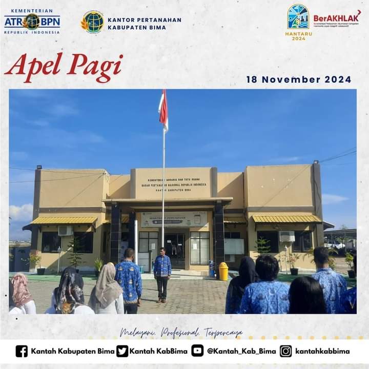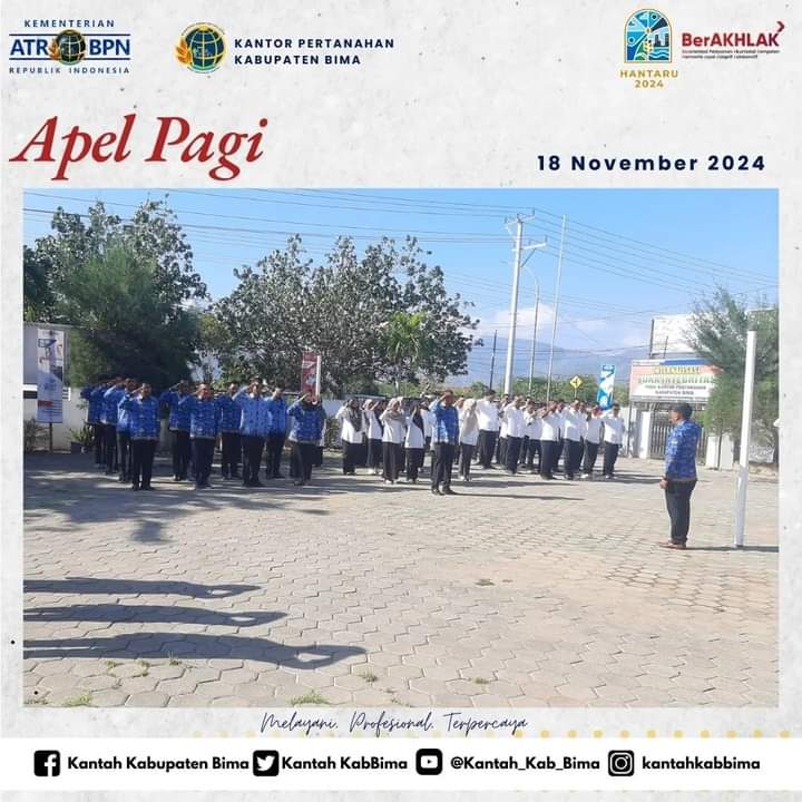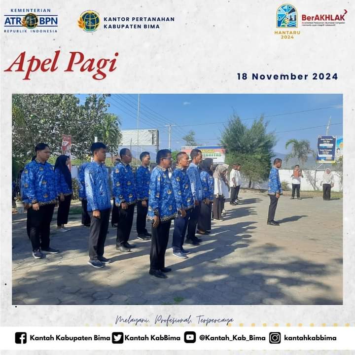 KeizalinNews-com – Kabupaten Bima. Kantor Pertanahan Kabupaten Bima sebagaimana biasa melaksanakan rutinitas apel pagi rutin pada hari Senin, (18/11/24). Apel pagi kali ini dipimpin oleh kepala seksi pengadaan tanah dan pengembangan KANTAH Kabupaten Bima, Bambang, SE. dan diikuti oleh seluruh pejabat dan pegawai lingkup KANTAH Kabupaten Bima yang berlangsung di halaman depan kantor setempat.