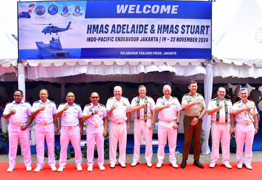KeizalinNews.Online Jakarta — Komandan Pangkalan Utama TNI Angkatan Laut (Danlantamal) III Jakarta Brigjen TNI (Mar) Harry Indarto, S.E., M.M. diwakili oleh Wakil Komandan (Wadan Lantamal) III Jakarta Kolonel Laut (P) Whisnu Kusardianto, S.E., M.H. menyambut kedatangan Kapal Perang Angkatan Laut Australia His Majesty’s Australian Ship (HMAS) Adelaide (L01) dengan komandan Captain Troy Duggan dan HMAS Stuart (FFH 153) dengan komandan Commander Warren Bechly bertempat di dermaga 208 pelabuhan Tanjung Priok, Jakarta Utara, Selasa (19/11/2024).