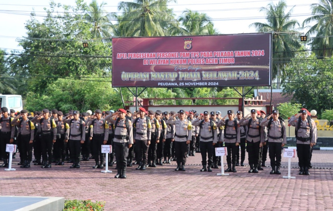 Keizailinnews online Aceh Timur Nanggroe Aceh Darussalam NAD – Polres Aceh Timur, Polda Aceh menggelar Apel Pergeseran Pasukan Pengamanan TPS dalam rangka Operasi Mantap Praja Seulawah 2024 untuk Pilkada Pemilihan Gubernur/Wakil Gubernur Aceh dan Bupati/Wakil Bupati Aceh Timur. Senin, (25/11/2024) pagi.