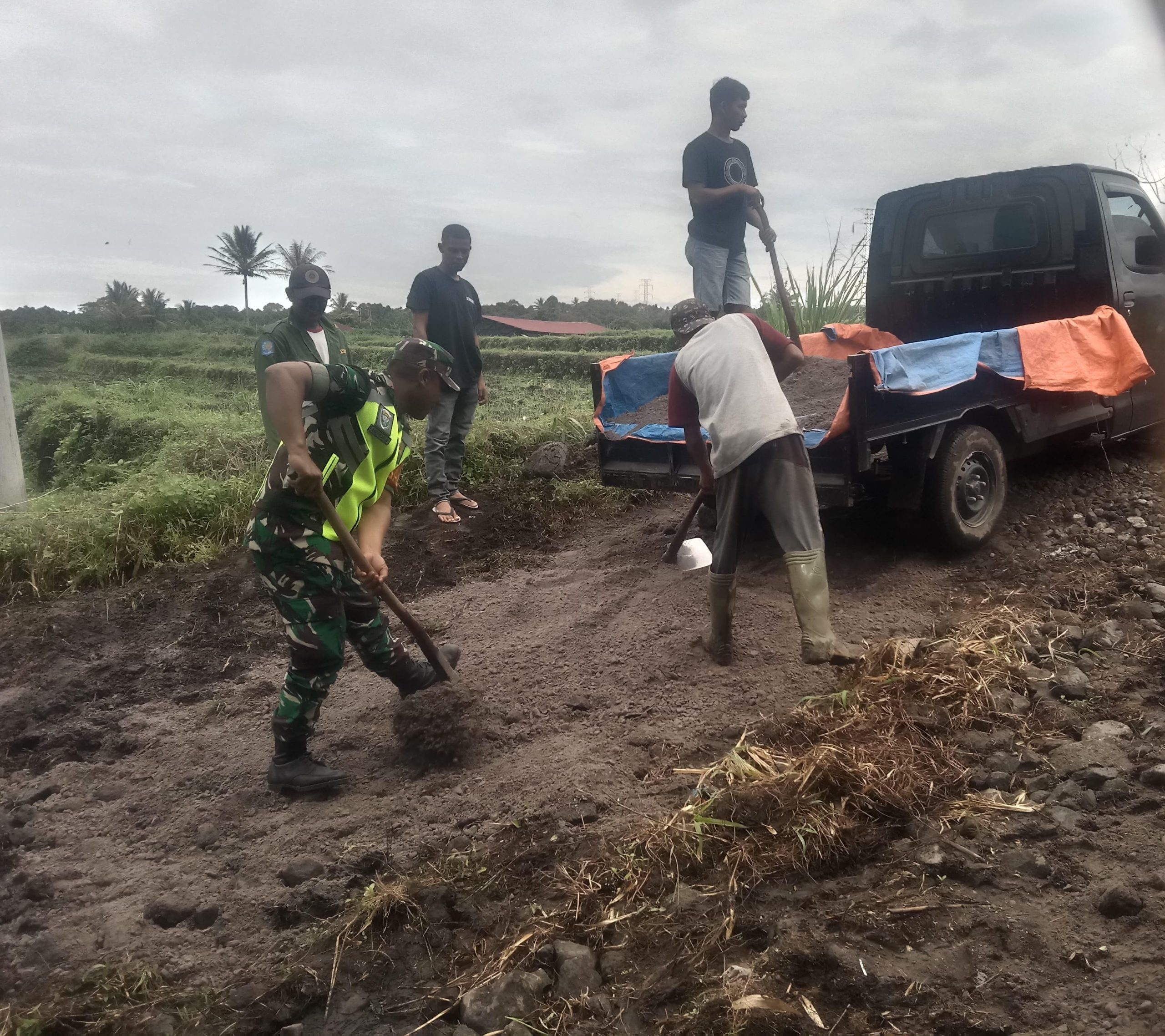 Danramil 03/TG Kapten Czi Aep Mukhran Halid saat dikonfirmasi mengatakan” Jalan tersebut merupakan akses masyarakat baik mengeluarkan hasil bumi maupun berbelanja kebutuhan pokok, untuk menghindari kecelakan babinsa bersama warga secara bergotong royong melakukan penimbunan dengan material pasir dan koral, sehingga jalan yang dilalui tidak licin dan berlumpur”