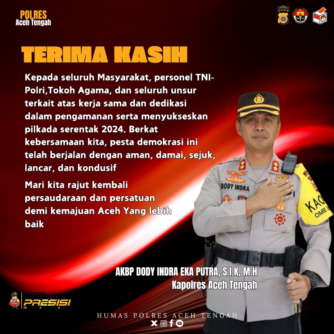 Keizalinnews.Online|Aceh Tengah-: Kapolres Aceh Tengah AKBP Dody Indra Eka Putra,S.I.K,M.H, beserta staf dan jajaran mengucapkan terima kasih yang sebesar-besarnya kepada seluruh elemen masyarakat Kabupaten Aceh Tengah, atas kerjasama dan partisipasinya dalam menjaga ketertiban dan kedamaian selama proses Pemilihan Umum pada Pilkada serantak 2024.