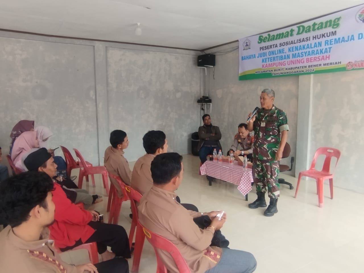 Keizalinnews.Online|Redelong-: Danramil 06/Bukit Kapten Inf Trimo, S.H., bersama Kapolsek Bukit memberikan Sosialisasi Hukum tentang bahaya judi online, kenakalan remaja dan ketertiban masyarakat di Desa Uning Bersah, Kecamatan Bukit, Kabupaten Bener Meriah, Jum’at (06/12/2024).
