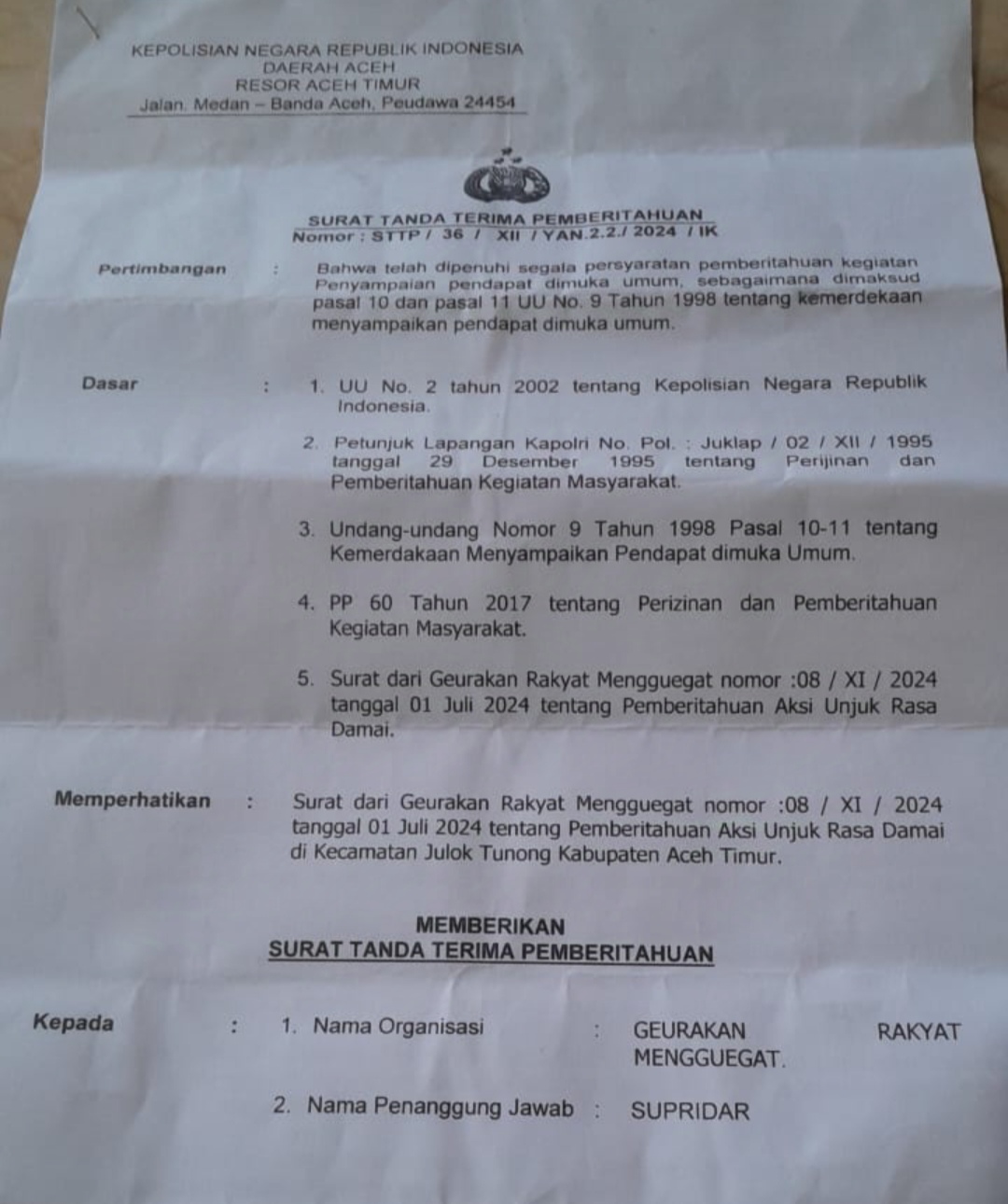 Supridar menyebutkan surat pemberitahuan telah disampaikan kepada Polres Aceh Timur,Jum’at (13/12/2024).Aksi pada 16 Desember merupakan aksi awalan dan rencana aksi lanjutan akan dilakukan pada beberapa titik sentral lainnya, jika harapan warga tidak direspon.