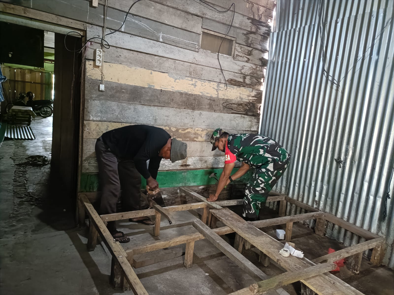 Keizalinnews.Online|Redelong-: Bantu ringankan pekerjaan warga, Babinsa Koramil 05/Permata Kodim 0119/BM, Sertu Ahmad Rido membantu warga memperbaiki dapur salah rumah warga bertempat di Desa Timur Jaya, Kecamatan Permata, Kabupaten Bener Meriah, Senin (16/12/2024).