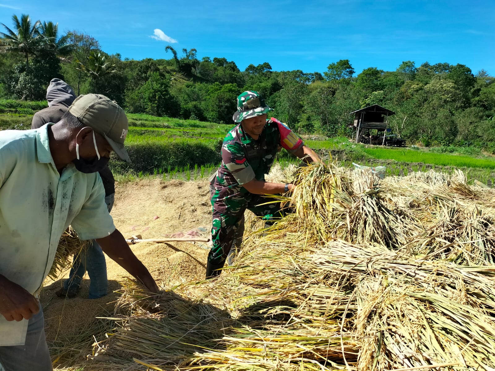 Keterlibatan Babinsa tidak hanya terbatas pada kegiatan panen padi, namun juga memberikan semangat dan motivasi kepada warga binaannya, sehingga para petani dapat mensukseskan
