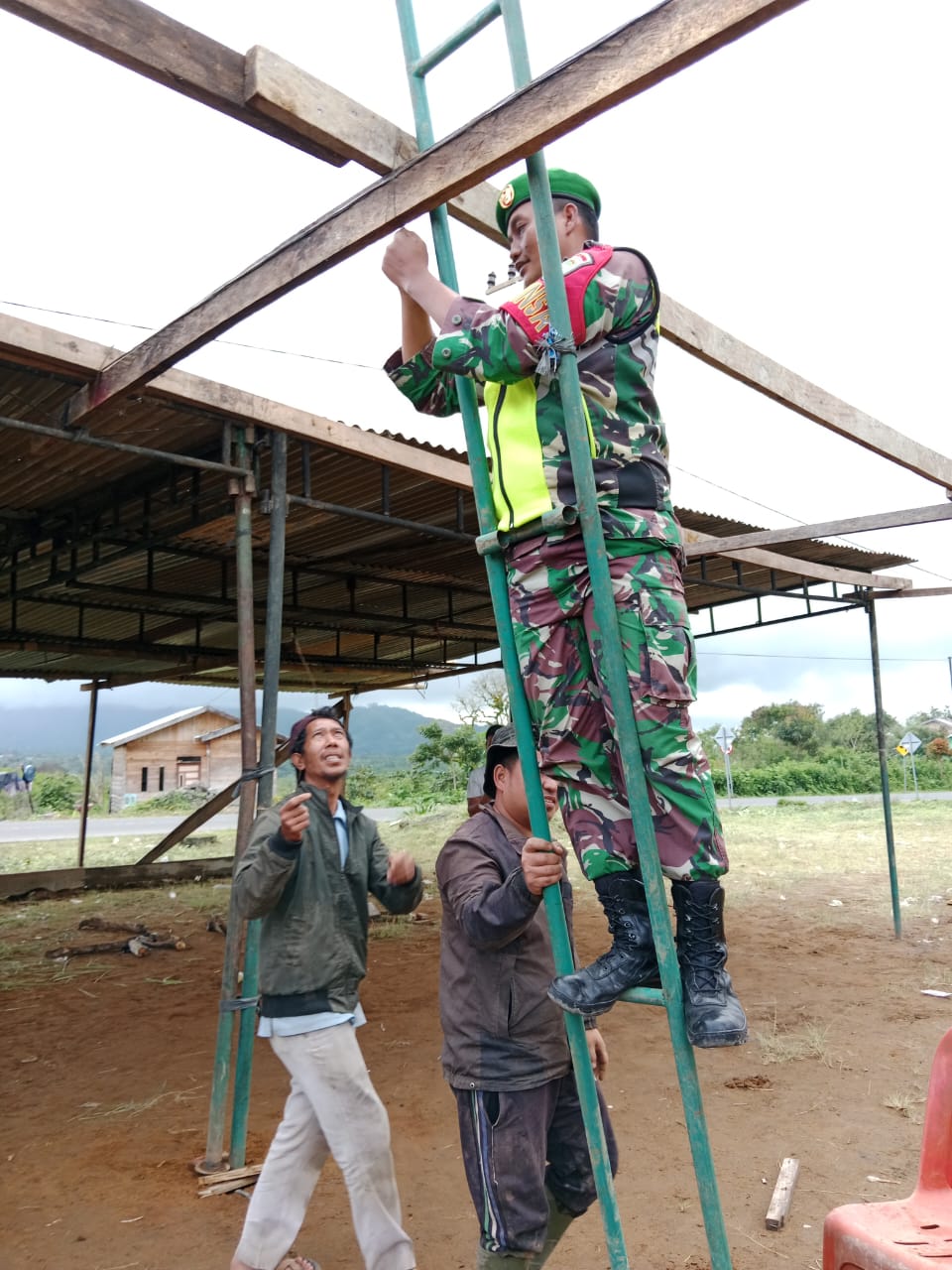 Dengan sigap Koptu Rahmad Sukri membantu warga setempat dalam proses pendirian tenda agar acara dapat berjalan lancar dan nyaman bagi para tamu undangan.