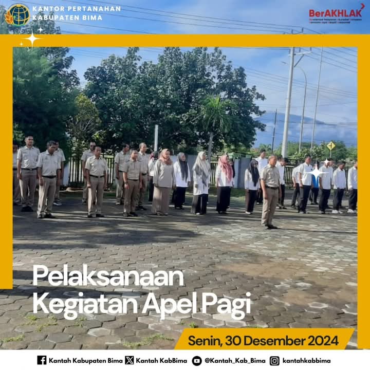 Pada Hari ini, Senin 30 Desember 2024 Telah Dilaksanakan Apel Pagi Yang Merupakan Kegiatan Wajib Dilaksanakan Oleh Seluruh Pegawai Lingkup Kantor Pertanahan Kabupaten Bima. Apel Pagi ini Dipimpin Oleh Kasubag TU Sukrin, S.H., Dalam Arahannya Pembina Apel Memberikan Arahan Untuk Tetap Meningkatkan Disiplin Serta Melayani Masyarakat Dengan Sepenuh Hati. Pembina Apel Juga Mengucapkan Selamat Kepada PPNPN Yang Telah Dinyatakan Lulus Seleksi PPPK.