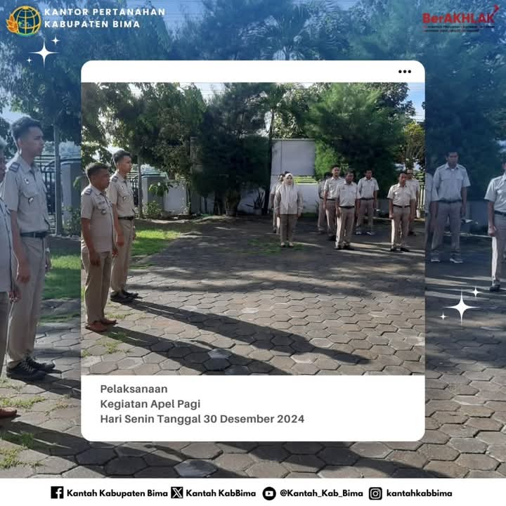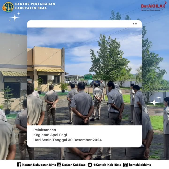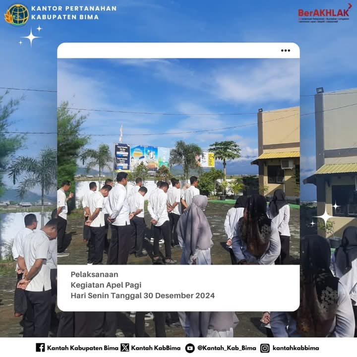 KeizalinNews-com – Kabupaten Bima. Kepala Sub Bagian Tata Usaha (KASUBAG TU) Kantor Pertanahan (KANTAH) Kabupaten Bima, Syukrin, SH. memimpin apel pagi yang merupakan kegiatan rutinitas wajib yang dilaksanakan oleh seluruh pegawai lingkup kantor pertanahan Kabupaten Bima. Bertempat halaman depan kantor setempat. Senin (30/12/24)