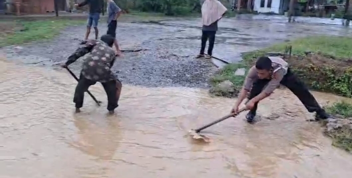 Sebagai bentuk tanggung jawab sosial dan profesional, personel Satlantas Polres Pidie Jaya bergerak cepat membersihkan saluran yang tersumbat.