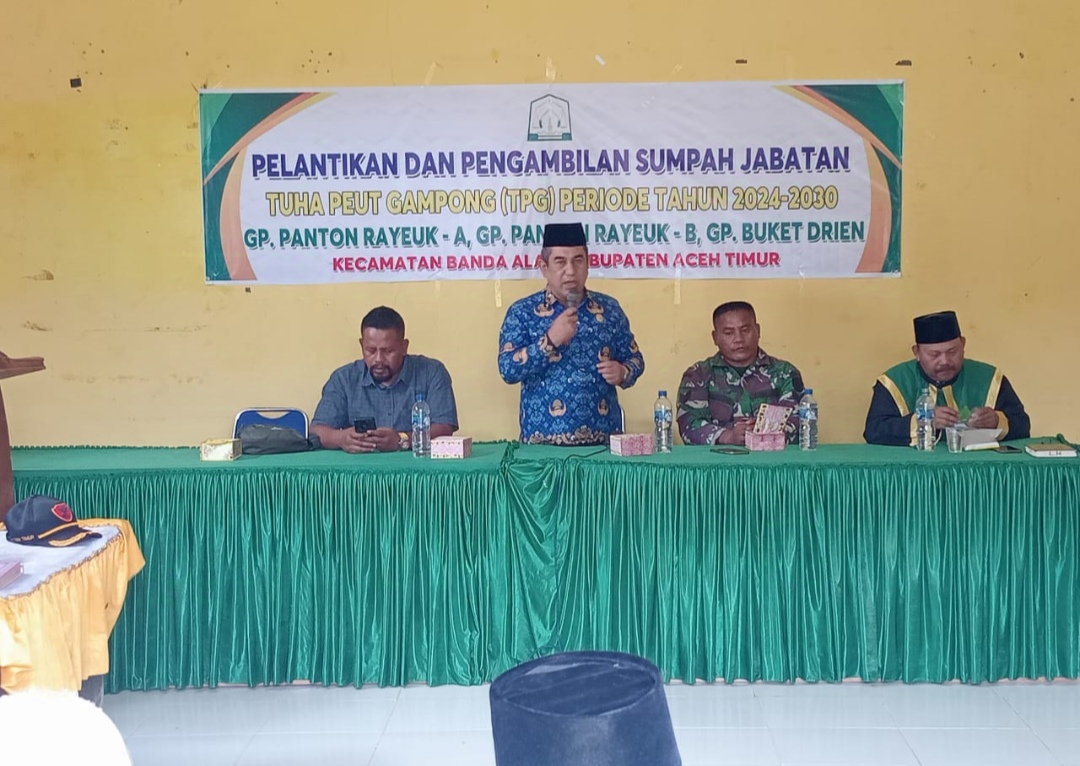 Dalam amanatnya Camat Banda Alam Azani , menyampaikan kepada tuha peut gampong yang baru diambil sumpah agar berkeja sesungguh – sungguh nya terhadap pengawasan baik vertikal maupun horizontal Sesuai dengan aturan yang berlaku,