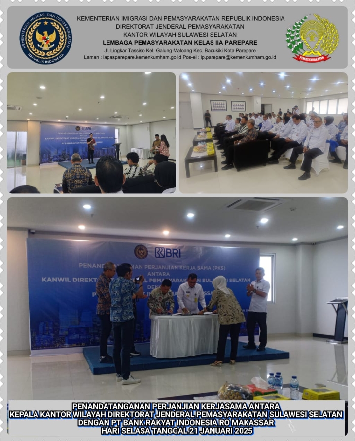 KeizalinNews.Com, Parepare (Sulsel)–Bertempat Aula Bank BRI Cabang Panakukkang Jl. Letjen Hertasning No.14 RW.06 Tidung Kec. Rappocini Kota Makassar telah dilaksanakan Penandatanganan Perjanjian Kerjasama antara Kepala Kantor Wilayah Direktorat Jenderal Pemasyarakatan Rudi Fernando Sianturi, A.Md.IP, SH, MH dengan Regional Chief Executive Officer (CEO) PT Bank Rakyat Indonesia RO Makassar D. Argo Prabowo terkait Layanan Payroll Gaji dan Tunjangan Kinerja Aparatur Sipil Negara (ASN) dilingkungan Direktorat Jenderal Pemasyarakatan serta penyediaan layanan perbankan lainnya oleh PT. BRI.Parepare, Selasa (21/1/2025)
