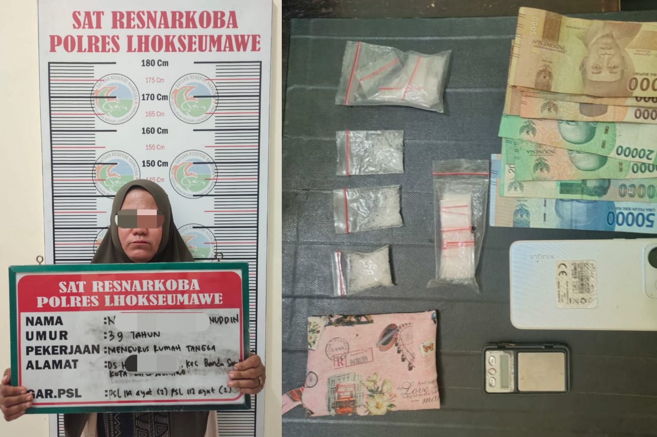 Keizalinnews.Online|Lhokseumawe-: Satuan Reserse Narkoba Polres Lhokseumawe berhasil mengamankan seorang perempuan yang diduga terlibat dalam tindak pidana penyalahgunaan narkotika jenis sabu pada Selasa (21/1/2025) sekitar pukul 17.30 WIB. Pelaku berinisial Nurlatifah (39), seorang ibu rumah tangga, ditangkap di rumahnya di Desa Hagu Teungoh, Kecamatan Banda Sakti, Kota Lhokseumawe.