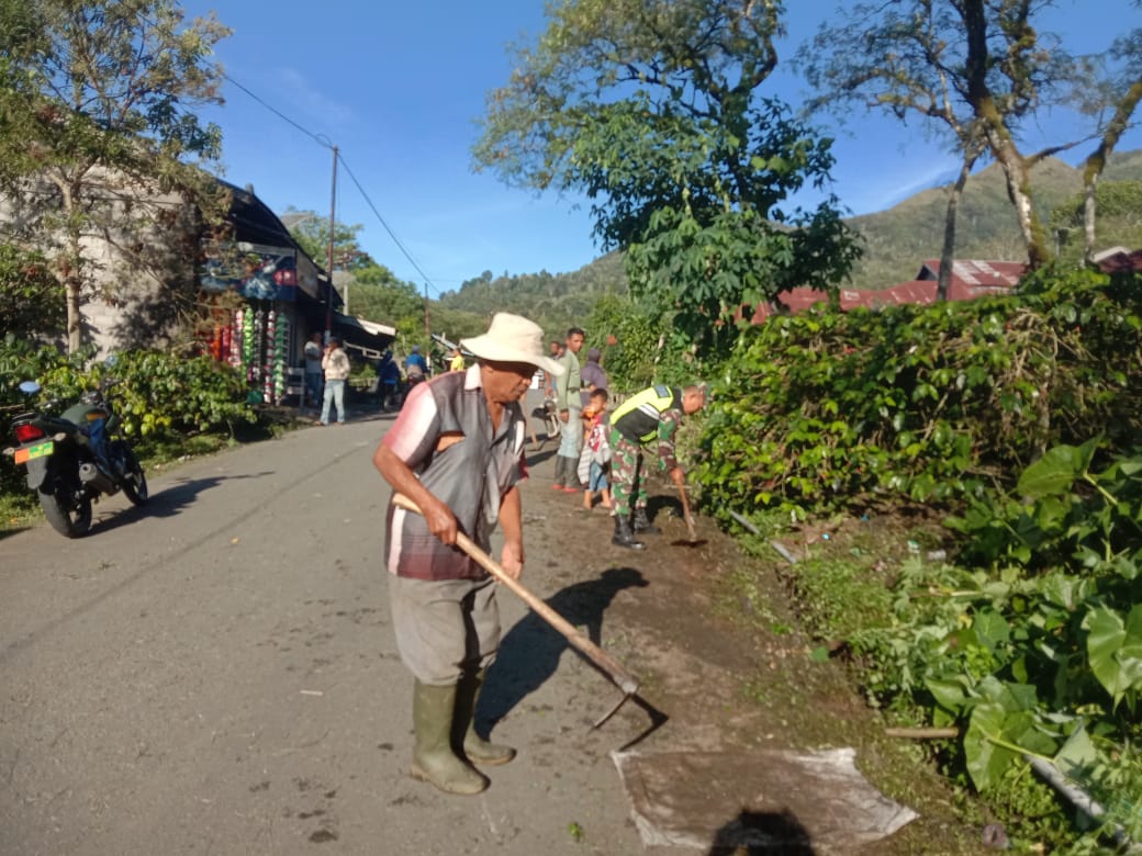 Serda Sukarsono melaksanakan gotong-royong bersama masyarakat membersihkan parit, sampah dan rumput liar di pinggir badan jalan di wilayah binaan tersebut, kondisi tersebut mendorong Babinsa mengajak masyarakat untuk bergotong royong guna melaksanakan pembersihan rumput dan sampah plastik sehingga nantinya membuat kondisi jalan menjadi kelihatan bersih dan terpelihara.
