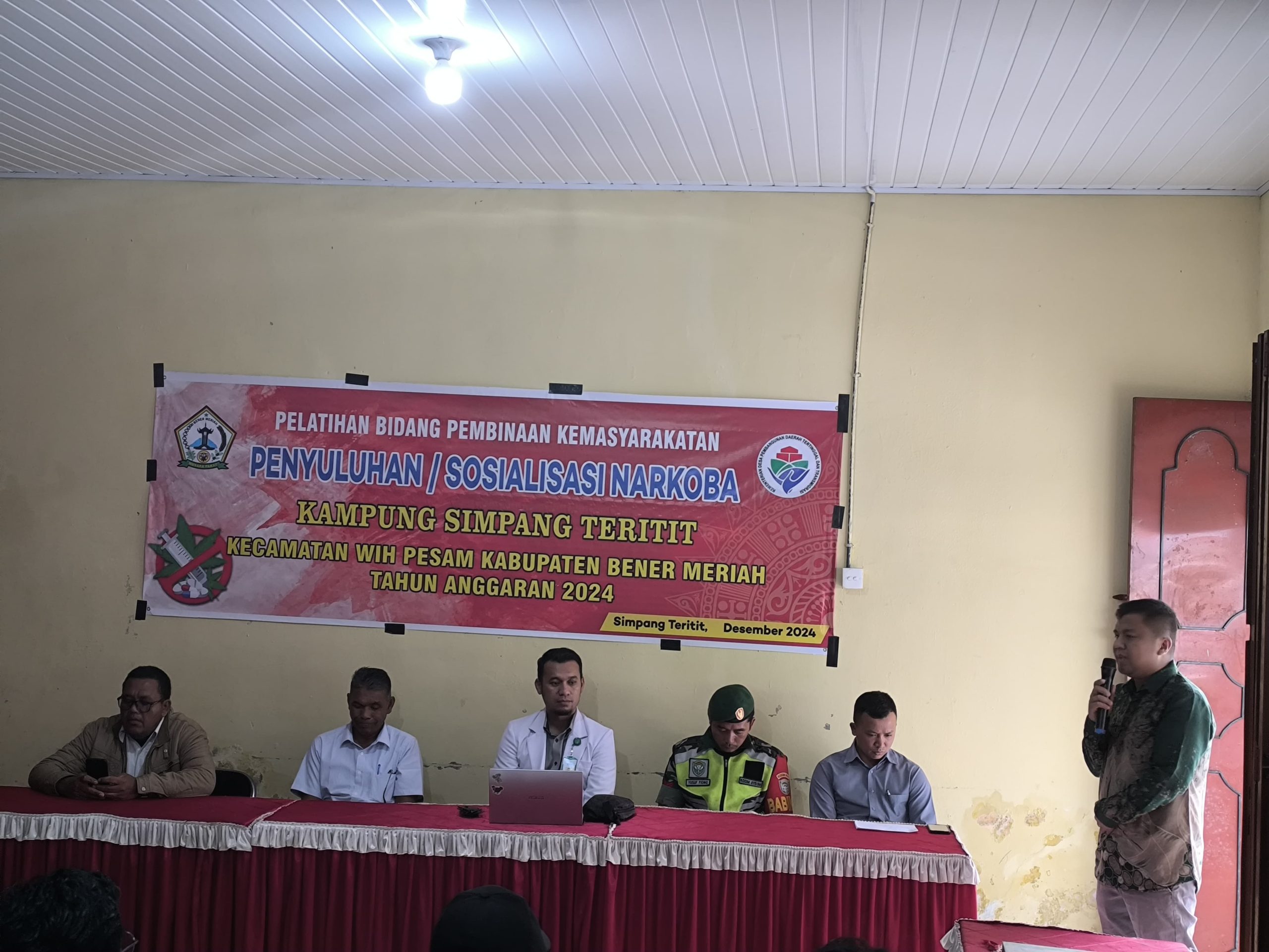 Keizalinnews.Online|Redelong-: Babinsa Koramil 02/Wih Pesam (WPS) Kodim 0119/Bener Meriah Koptu Yusuf Fiono menghadiri sosialisasi bahaya narkoba yang berlangsung di Gedung Serbaguna Desa Simpang Teritit, Kecamatan Wih Pesam, Kabupaten Bener Meriah. Kegiatan ini menghadirkan Dr. Insan Sarami Aritanoga, Sp.KJ, sebagai moderator dan pemateri utama.pada (07/02/2025)