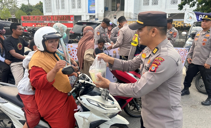 Kegiatan ini berlangsung di depan Masjid Islamic Center At-Taqarrub, Kecamatan Trienggadeng, sebagai bentuk kepedulian Polres Pidie Jaya terhadap masyarakat yang sedang menjalankan ibadah puasa.