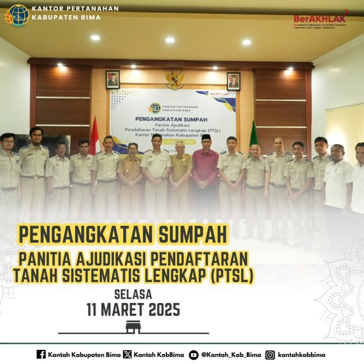 KeizalinNews-com – Kabupaten Bima. Dalam upaya mempercepat Program Pendaftaran Tanah Sistematis Lengkap (PTSL), Kepala Kantor Pertanahan Kabupaten Bima Lalu Makhyaril Huda, S.ST., MH melaksanakan pengambilan sumpah terhadap Panitia Ajudikasi Pendaftaran Tanah Sistematis Lengkap Tahun 2025 Bertempat Di Aula Adhi guna Kantor Pertanahan kabupaten Bima, Selasa 11 Maret 2025.
