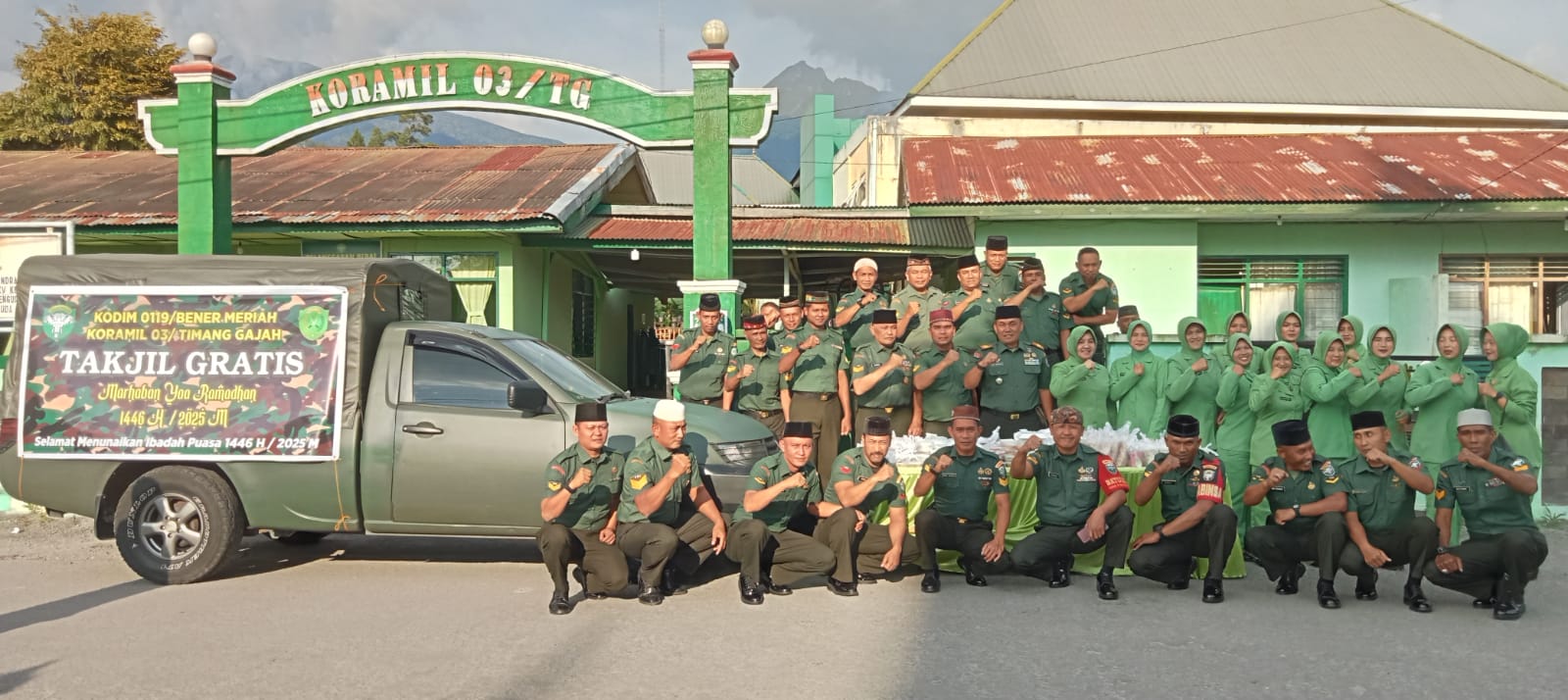 Keizalinnews.Online|Redelong-: Komando Rayon Militer 03/TG Kodim 0119/BM , mengelar berbagi takjil gratis. Kegiatan tersebut berlangsung di depan Makoramil bertempat di Kecamatan Timang Gajah, Kabupaten Bener Meriah” Rabu, 19 Maret 2025.