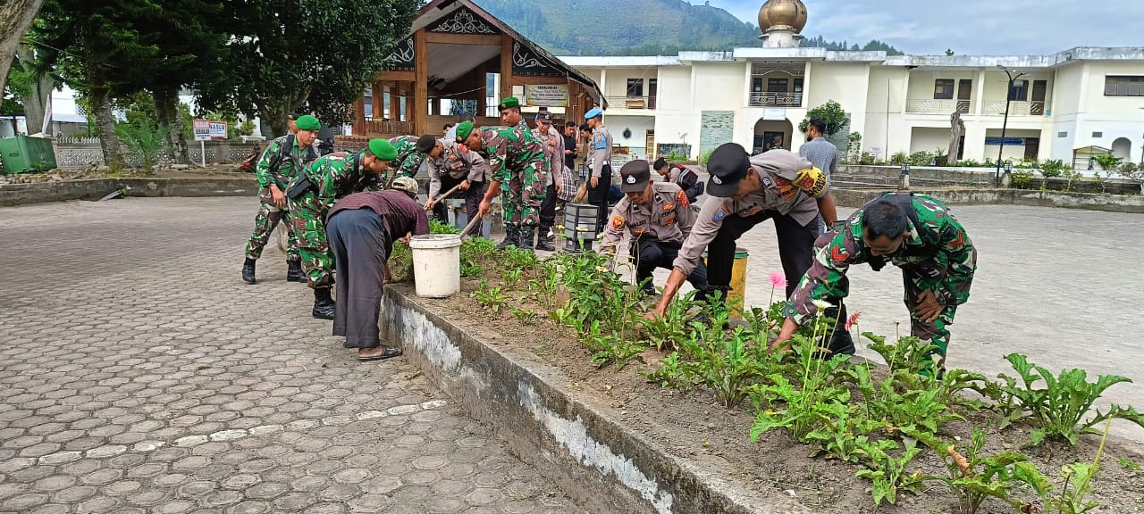 menyampaikan bahwa kegiatan ini merupakan bagian dari kepedulian TNI- Polri terhadap lingkungan dan bentuk kebersamaan dengan masyarakat dalam menjaga kebersihan serta kenyamanan tempat ibadah.
