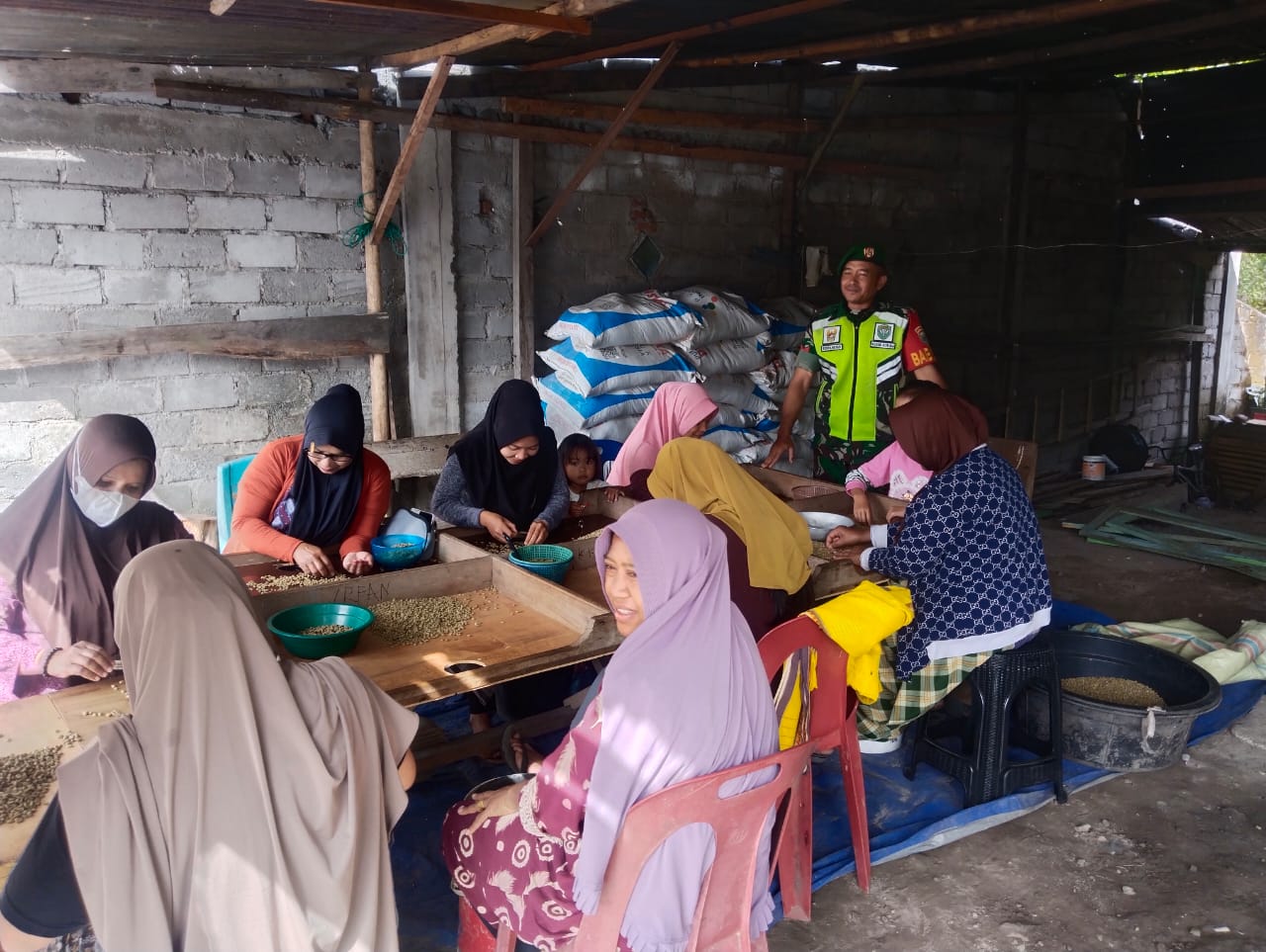 “Dalam kegiatan tersebut, Babinsa melihat cara dan membantu proses penyortiran biji kopi sebagai usaha rumahan”.
