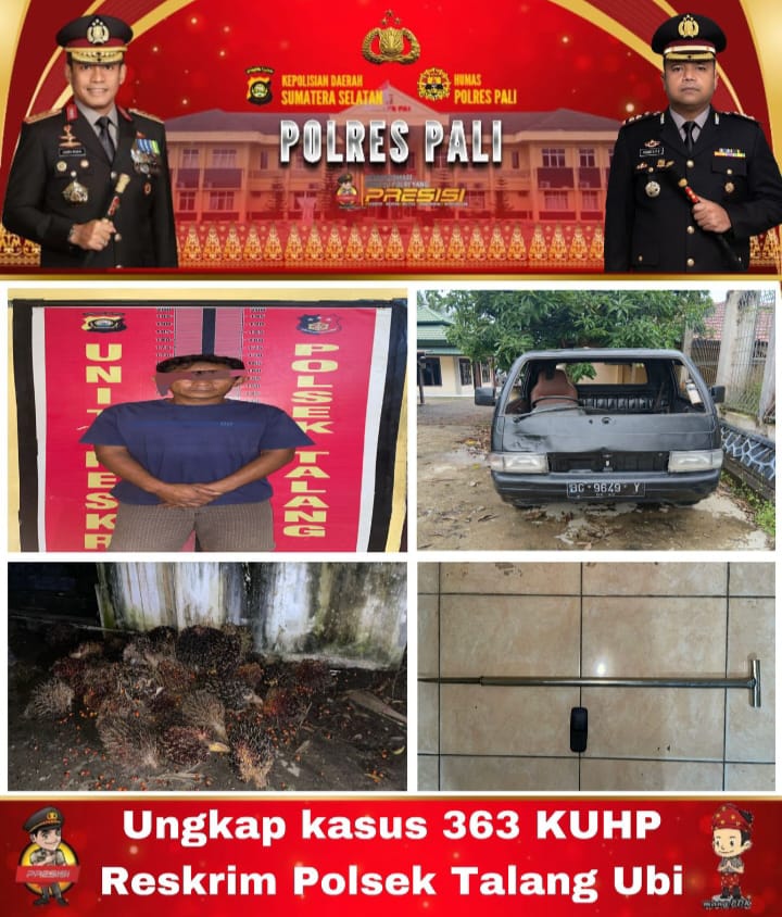 PALI, – Satuan Reserse Kriminal Polsek Talang Ubi berhasil mengungkap kasus tindak pidana pencurian dengan pemberatan buah kelapa sawit milik PT Surya Bumi Agro Langgeng,yang berlokasi di Blok 28 Divisi I Jerambah Besi Desa Karta Dewa,Kecamatan Talang Ubi,Kabupaten Penukal Abab Lematang Ilir (PALI).